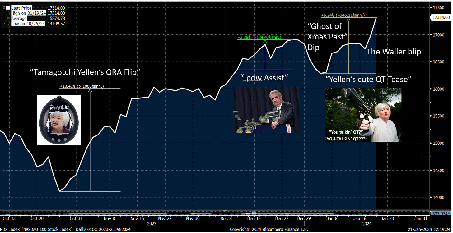 Jan 6th, Tamagotchi Yellen & the Fed drop a bomb with Yellen’s Cute QT Tease where Lorie Logan said that the Fed should slow QT (yes, I know that this is the Fed’s job, come on, play along). The market RAMPED because it matters. Read that Shrubstack, it was a good one.