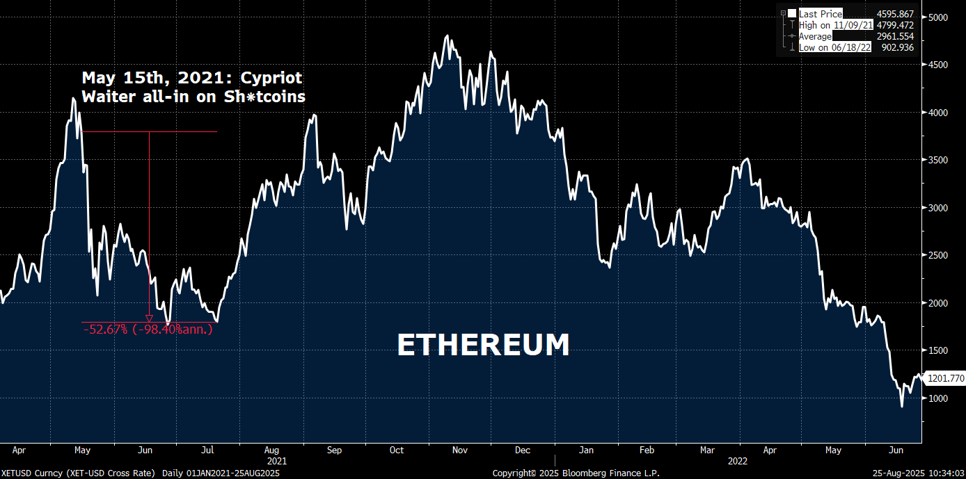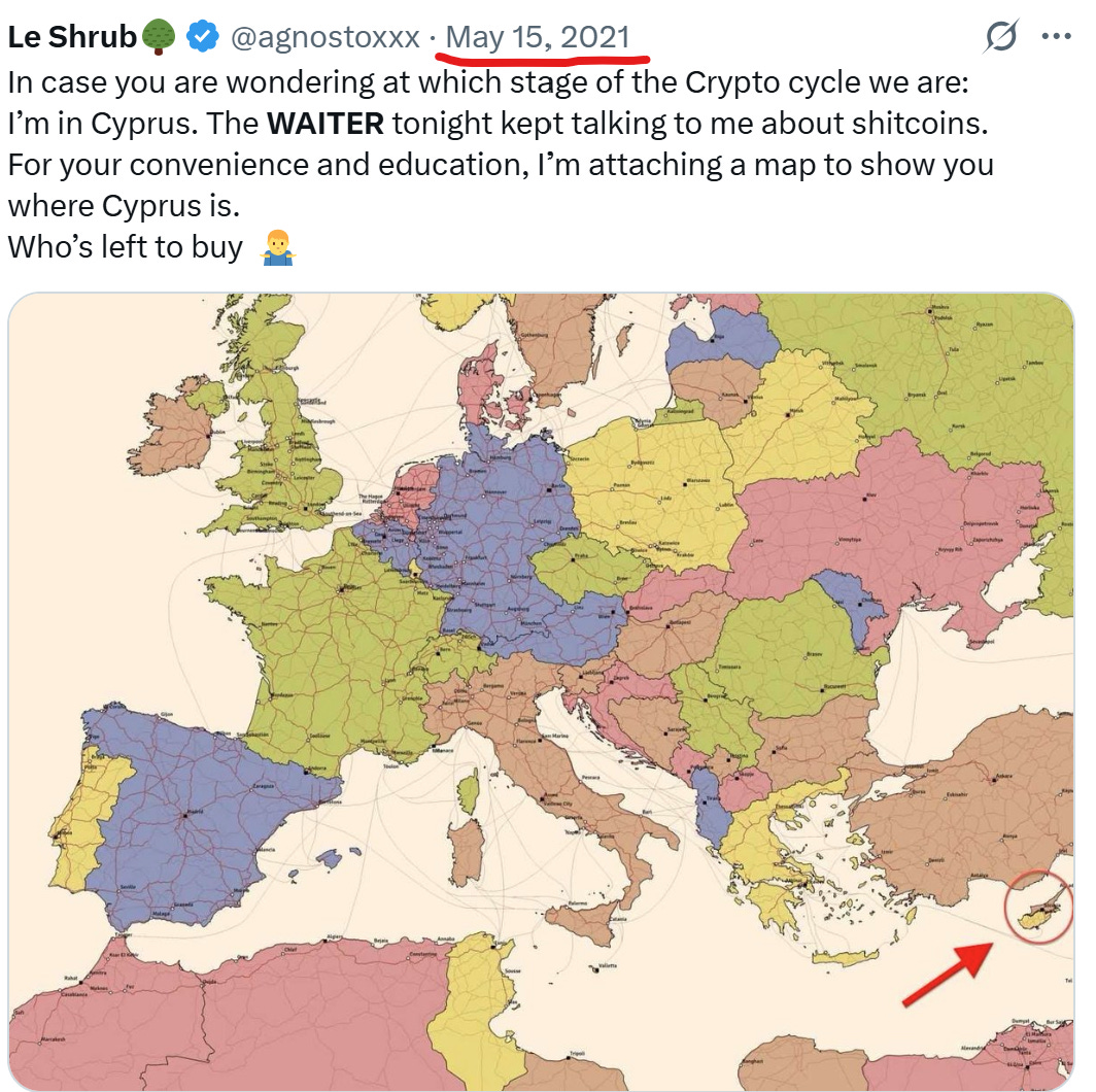Secondly, a waiter in CYPRUS that was all-in sh*tcoins, was even more cause for concern since Cyprus is an island in the middle of the Mediterranean and far away from the speculative frenzy of Wall Street.