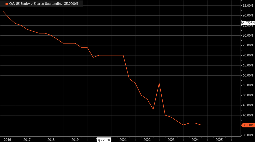 Since the cooperation agreement between the two parties, CAR proceeded to buy back shares and reduced its shares outstanding from 95m to 35m over a decade!!