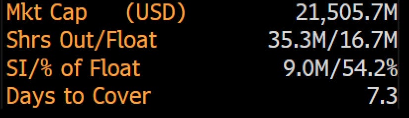 Per Bloomberg, the short interest is 9m shares or 54% of Bloomberg’s float, but more like 90% of our estimated float.