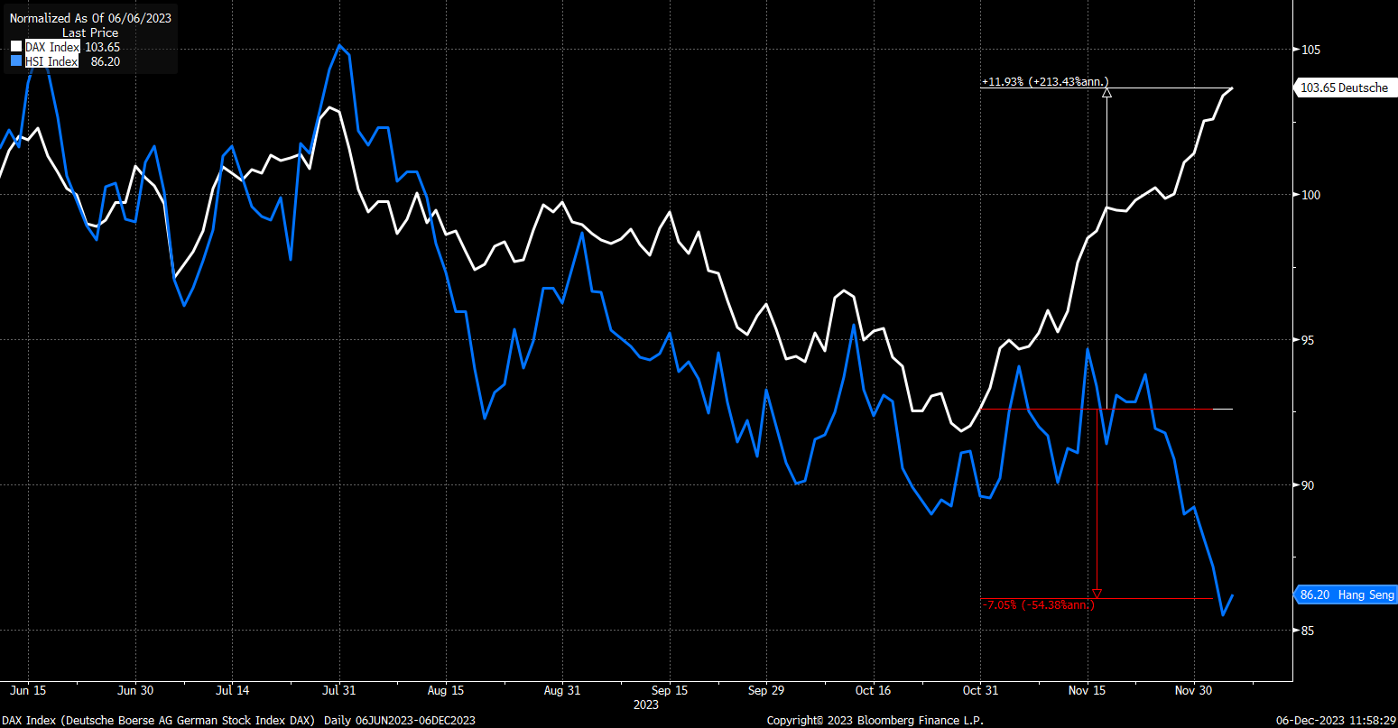 What I find weird about the whole thing though is that in the meantime the Chinese market is collapsing: On a relative basis the DAX has outperformed the HSI by nearly 20% in a month (chart below)! I find this strange because the DAX is usually a bellwether of global economy and used to be quite correlated with Asia. This is a called a D I V E R G E N C E !