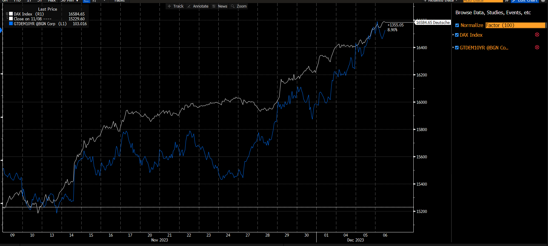 The only rational explanation for the DAX strength is of course that the Bond Yields in Europe have collapsed (courtesy of a Yellen + Lagarde tag-team!), and the DAX is basically just tracking the strength of the Bond Market.