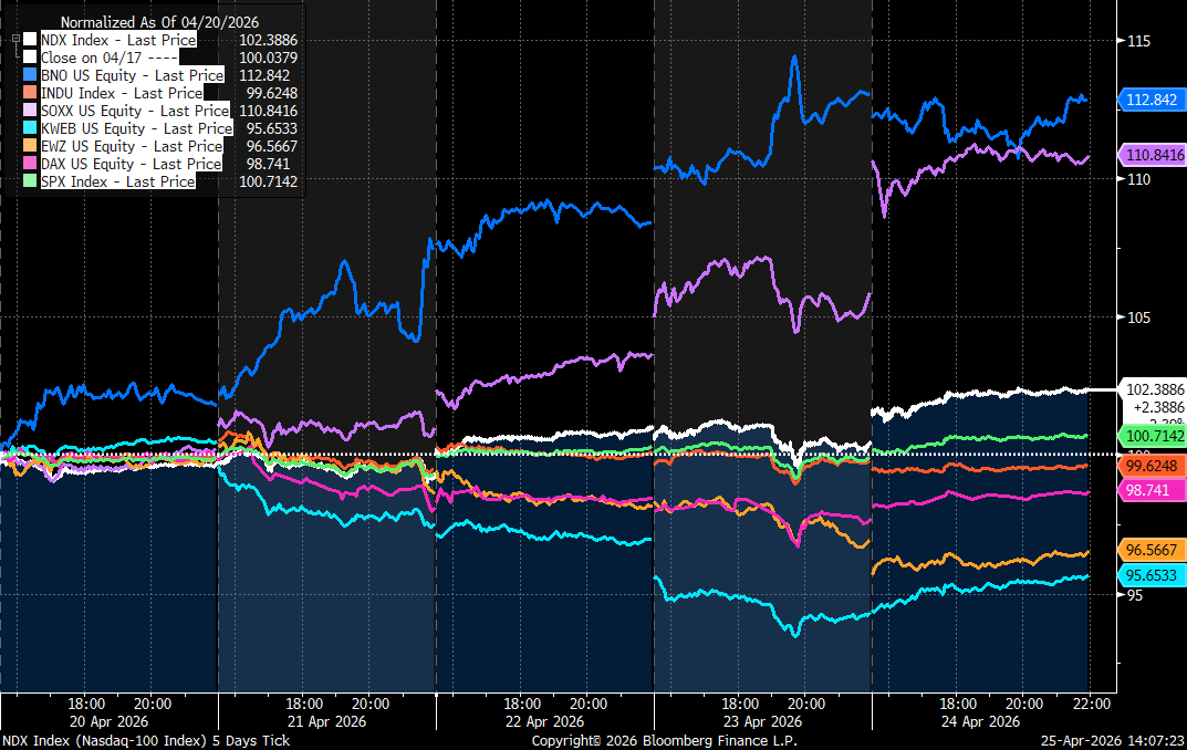 Brent +13%, SOX +11%, Nasdaq +2.4%, S&P +0.7%, DOW -0.4%, DAX -1.3%, Brazil -3.4%, KWEB -4.3%