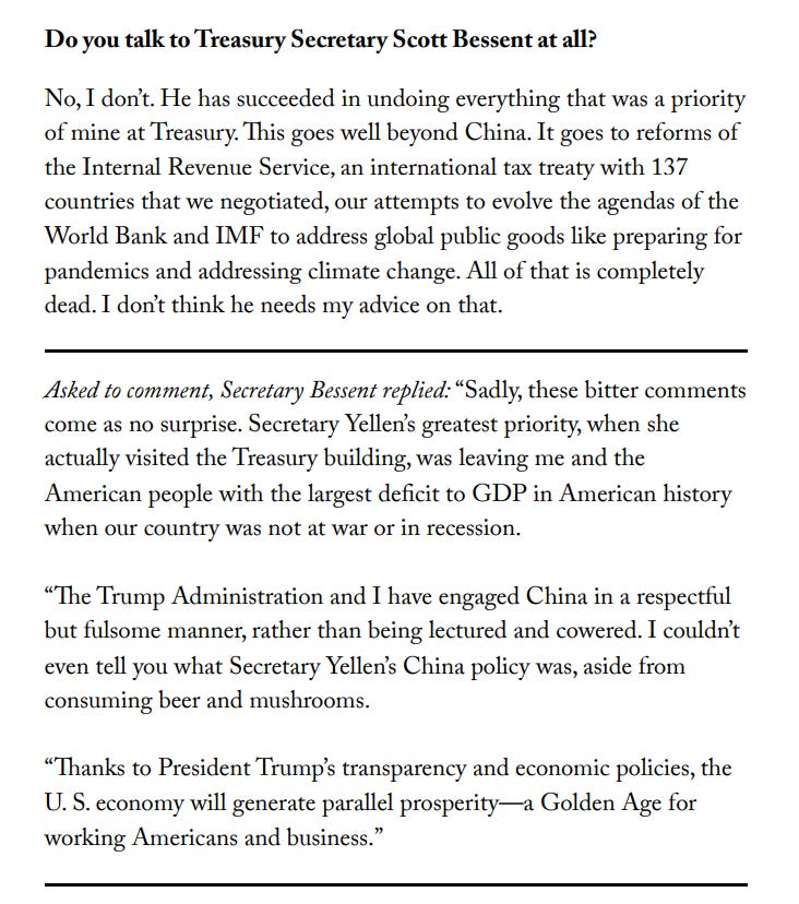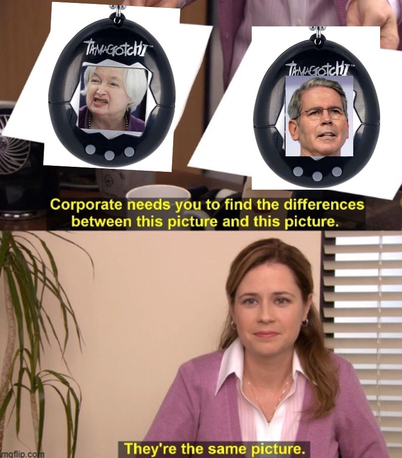 Poor Jerome is going through his own version of the “Stonkholm Syndrome”. His new boss is kinda like his old boss and Bessent has nearly completed his transformation to a Tamagotchi. When I read this comment by Yellen and then Bessent’s reply , I was literally on the floor: