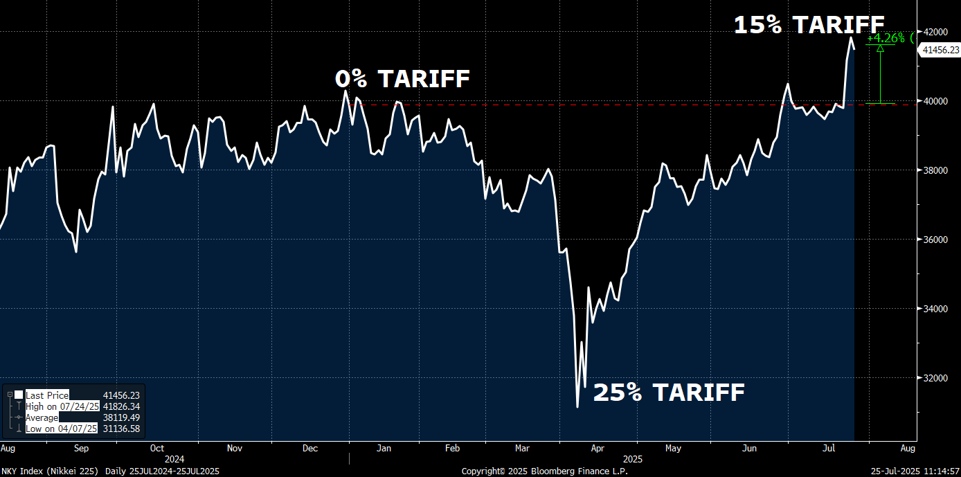 We can better illustrate this with the case of the Nikkei Index, which is now higher than the pre-Liberation Day levels, simply because the US Tariffs on Japan came in "less bad” than expected, at 15% vs 25% originally feared.
