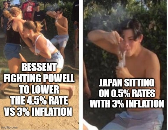 To give credit to Bessent, if there is one country that’s REALLY smoking something it’s JAPAN! Bessent just called out the BOJ that they are behind the curve, and rightly so. Lets do some simple mafs: