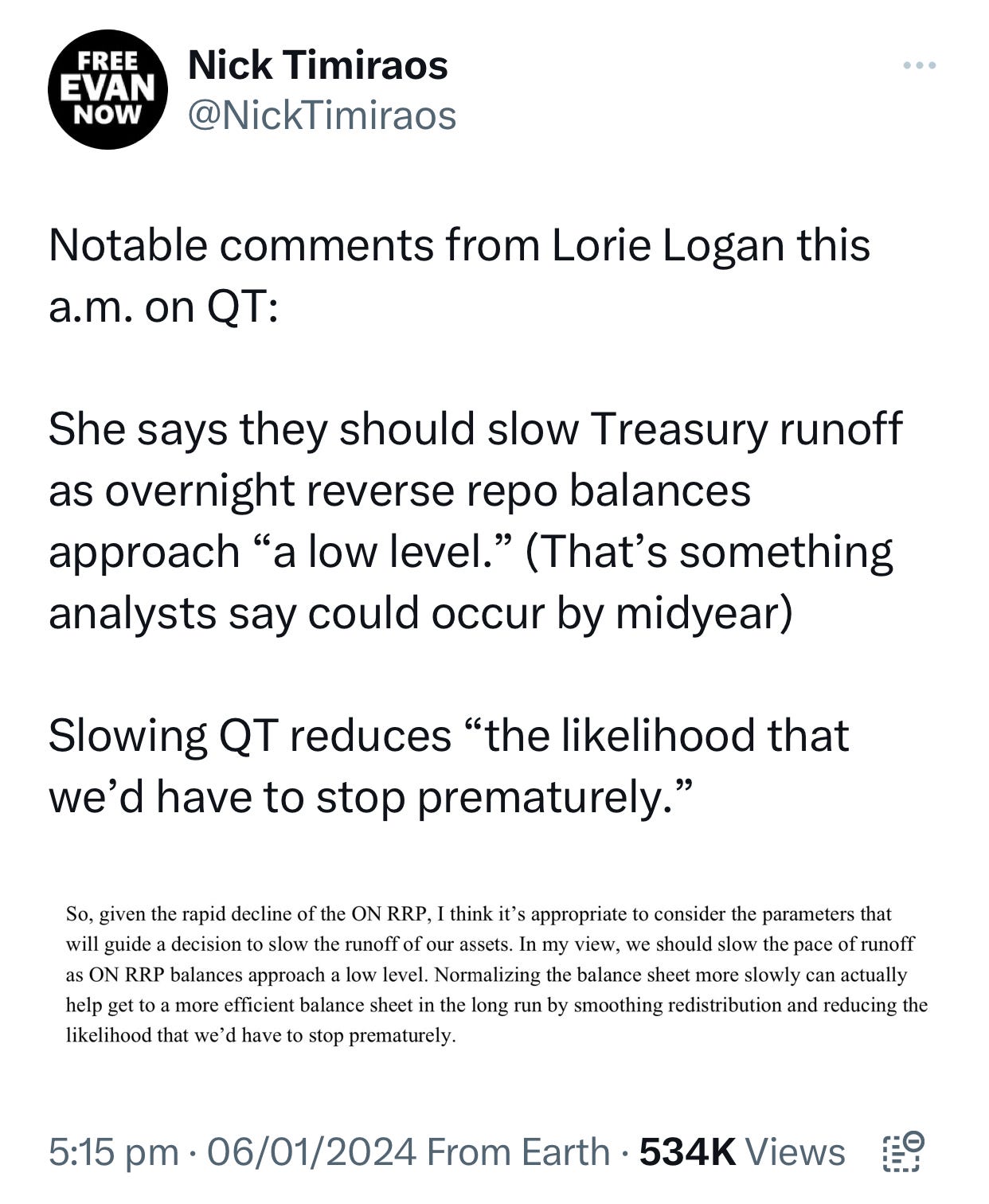 Just when I wanted to move on and focus on better things, the Re-Election Brigade (led by General Yellen) pulls another rabbit out of the hat and draws me back in the macro arena. This time “they” brought out Lorie Logan, the Fed’s plumbing expert, and their weapon of choice this time is “Quantitative Tightening” aka QT, which sounds a lot like “Cutie” but is anything but cute.